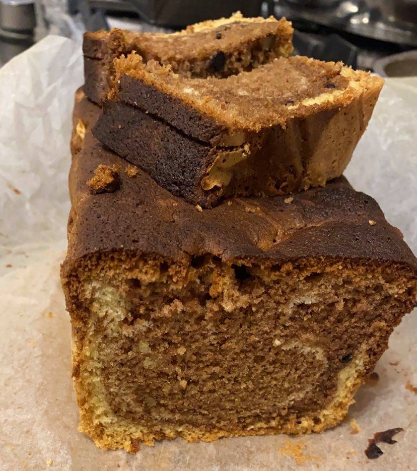 Inainte sa torn in forma de copt, pun in alt bol jumatate din compozitie si o amestec cu crema de ciocolata neagra Roshen. Amestec bine, bine, tot in acealasi ritm incet si la final, o adaug peste prima parte de compozitie, cea alba. Un truc mic aici – pentru a obtine un efect marmorat, puteti lua o scobitoare si sa incepeti sa realizati anumite desene in chec, pentru a ingloba cele doua culori si sa aiba un aspect super comercial, exact ca in reviste. 😊